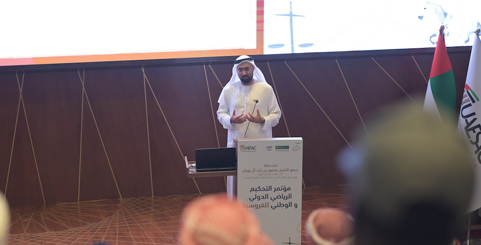 تحت رعاية سمو الشيخ منصور بن زايد آل نهيان نائب رئيس مجلس الوزراء وزير ديوان الرئاسة رئيس دائرة القضاء بأبوظبي .. اختتمت اليوم فعاليات مؤتمر التحكيم الرياضي بين القانون الدولي والوطني لرياضة " الفروسية" الذي نظمه مركز الإمارات للتحكيم الرياضي بالتعاون مع دائرة القضاء بأبوظبي وقرية الإمارات العالمية للقدرة والذي استضافته دائرة القضاء بأبوظبي على مدار يومي 16و17 فبراير الحالي بحضور جميع المنتسبين لرياضة الفروسية من فرسان ومدربين وإداريين وحكام ومختلف المعنيين والعاملين في قطاع هذه الرياضة.